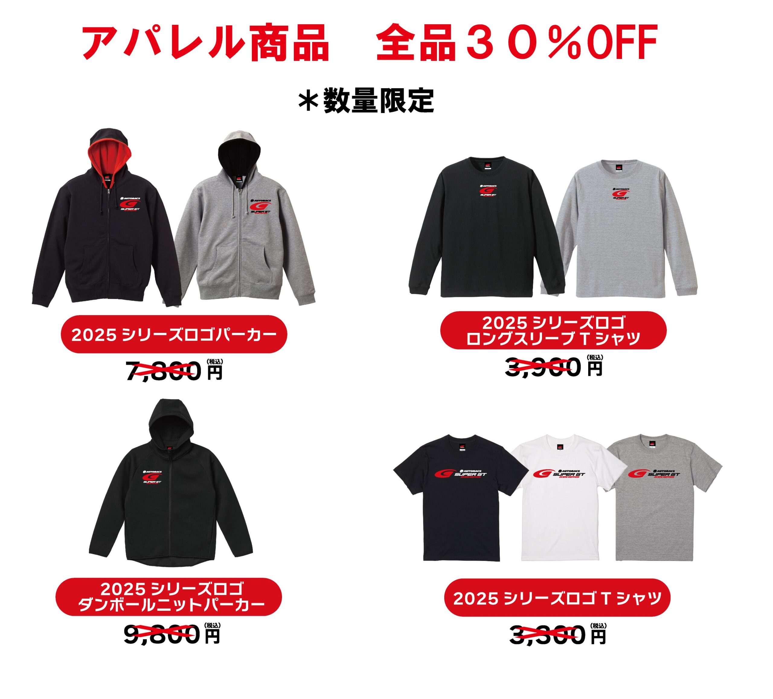 当日は、SUPER GTオフィシャルグッズのアパレル商品が全品30%OFF!