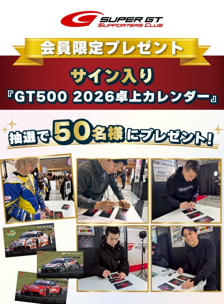 SUPER GTサポーターズクラブ会員の皆さまの中から、抽選でサイン入りGT500 2026卓上カレンダーをプレゼントいたします。