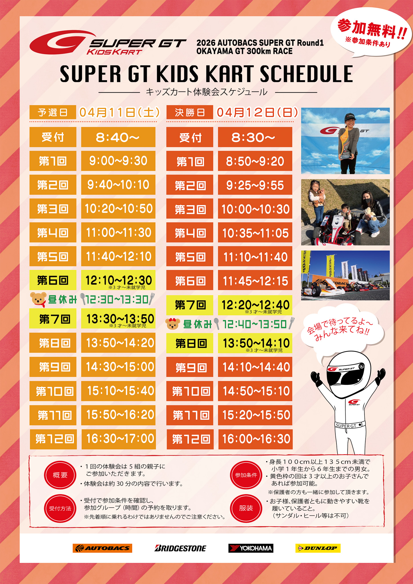 また、参加申し込みは当日の事前予約制となりますので、詳しくはキッズカート受付にてご確認ください(^^)