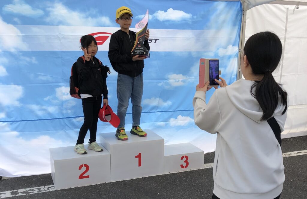 キッズカート体験会エリアに設置された表彰台フォトスポットでは、撮影した写真をその場でSNSに投稿するとプレゼントをGET!