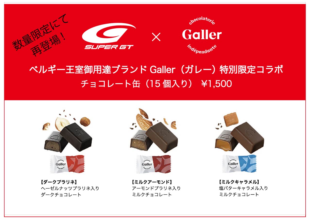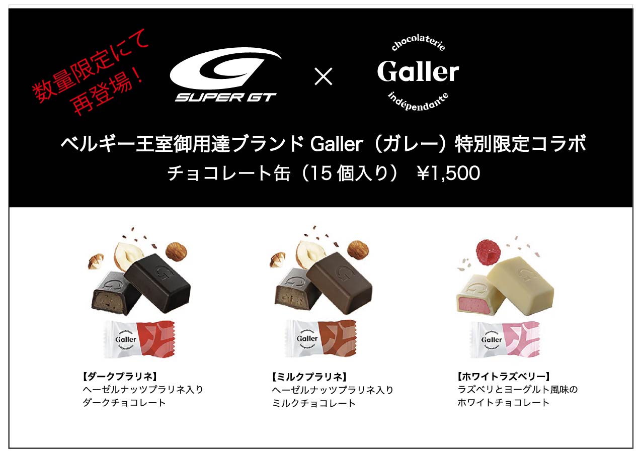 本商品は、ベルギー王室御用達ブランド「Galler」とのコラボレーションによる、 SUPER GTオリジナルデザインの特別仕様。 前回販売時もご好評をいただいた人気商品が、岡山大会限定で再登場となります。