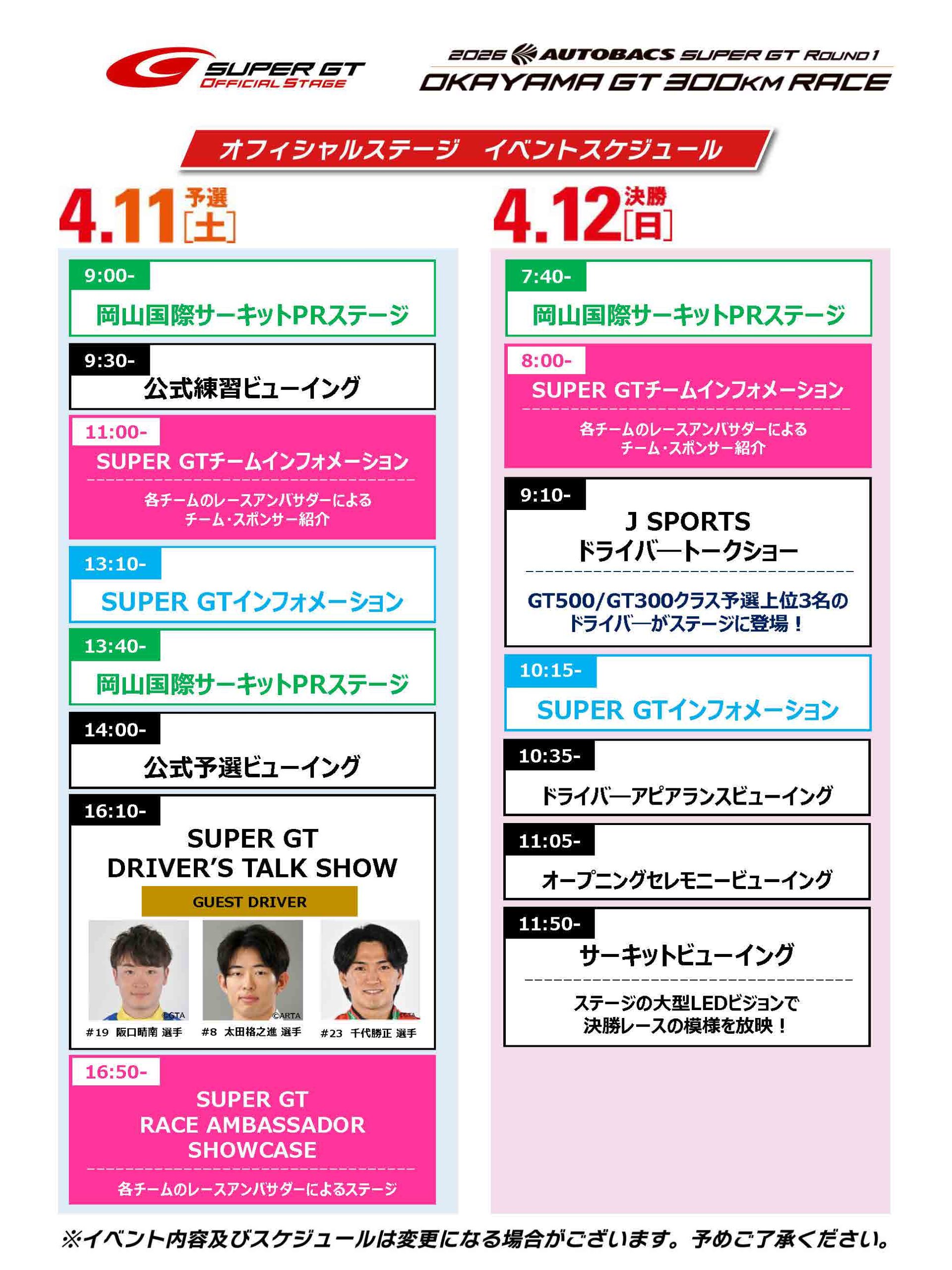 <2026 AUTOBACS SUPER GT Rd.1 OKAYAMA GT 300km RACE オフィシャルステージスケジュール>