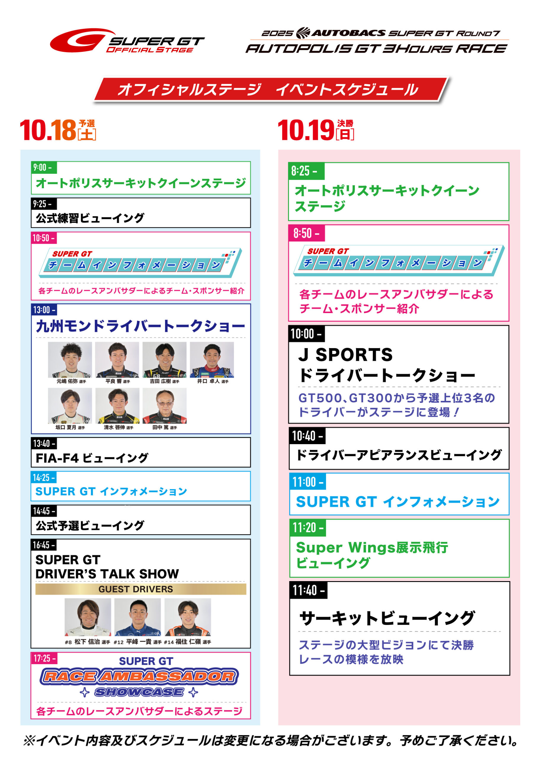 <2025 AUTOBACS SUPER GT Rd.7 AUTOPOLIS GT 3Hours RACE オフィシャルステージスケジュール>