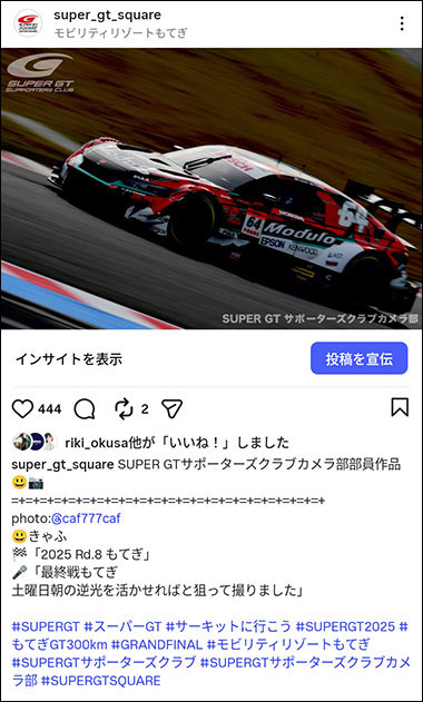 SUPER GTサポーターズクラブカメラ部部員として、SUPER GTの写真募集企画に参加いただけます。採用されると、SUPER GT SQUAREのInstagramのアカウント上のフィード投稿で、部員の作品として、撮影者のアカウントとともに紹介されます。